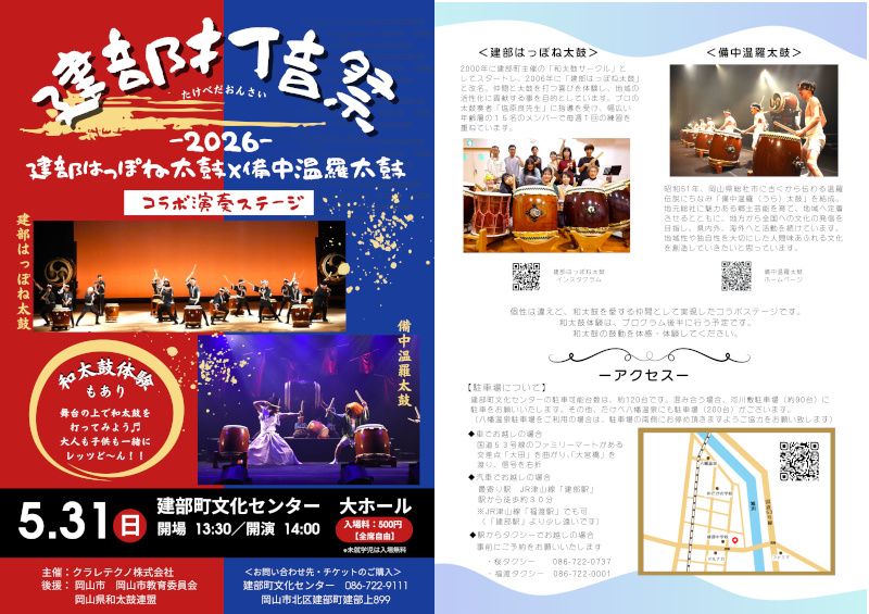 「建部打音祭 -2026- 建部はっぽね太鼓×備中温羅太鼓」を開催します。