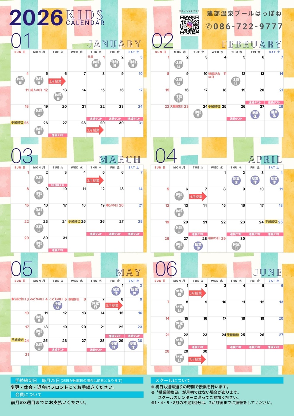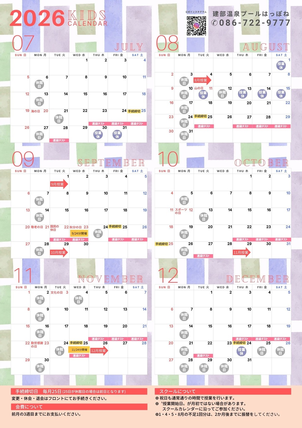 建部温泉プールはっぽね 2026年KIDSクラスカレンダー