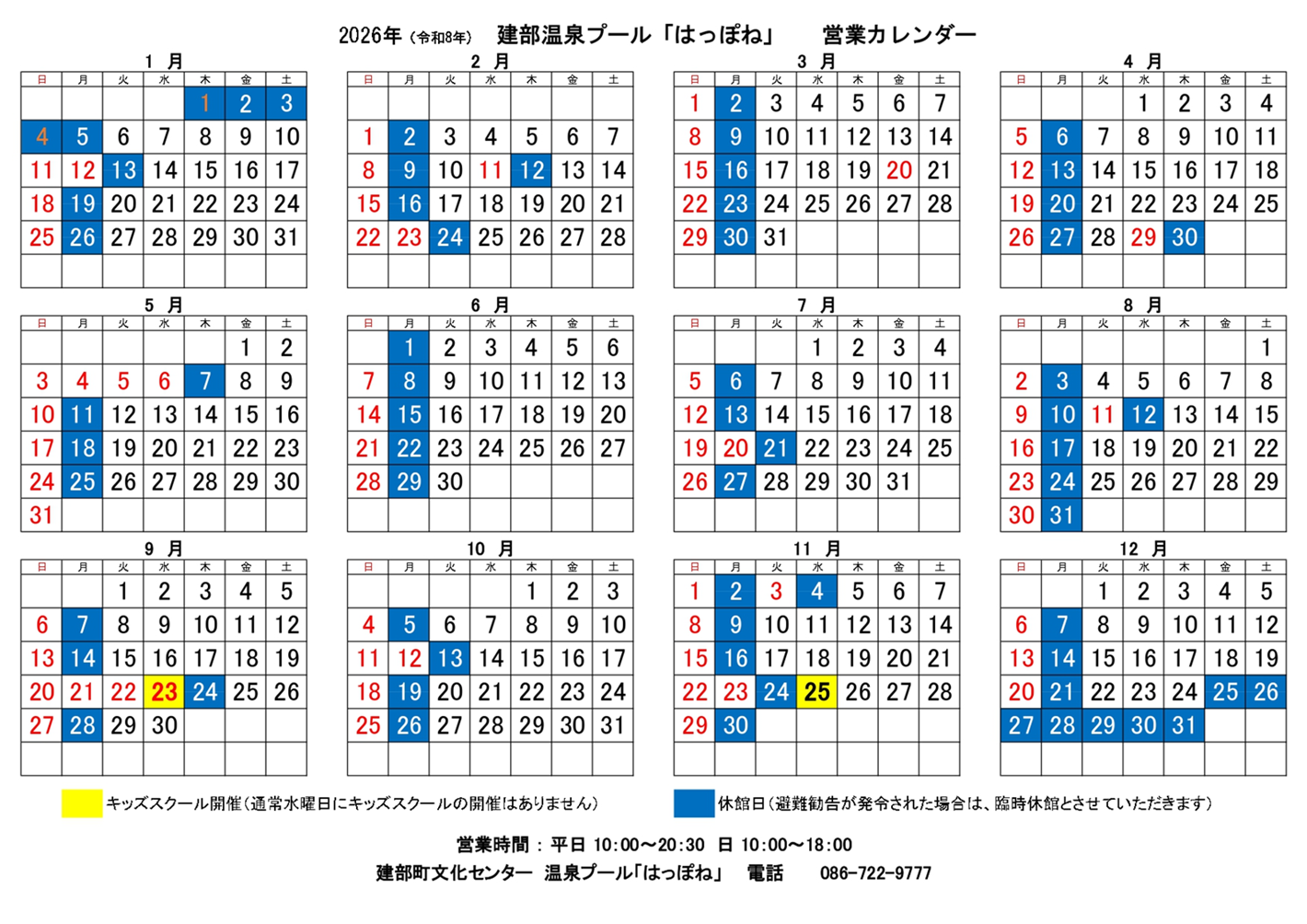 - 建部温泉プールはっぽね2026年営業カレンダー(2025/12/10)